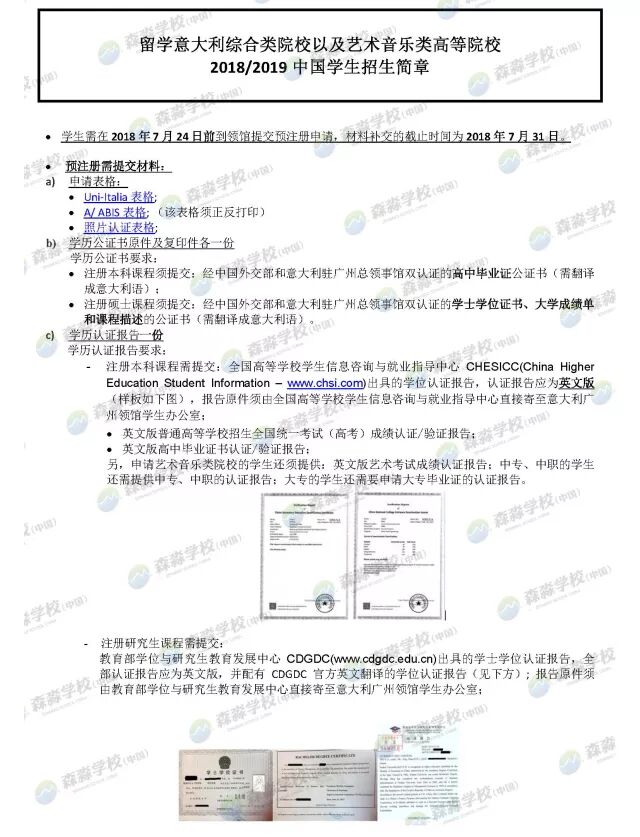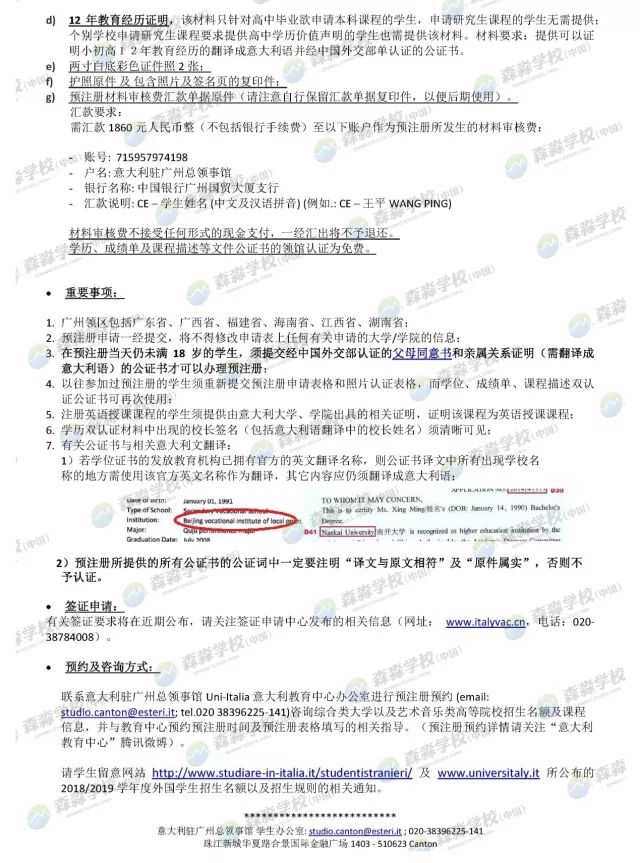 森淼TIPS ▶ 请务必在银行柜台办理服务费汇款,保留纸质回折,建议保留电子扫描件以防再次需要。 ▶ 所有材料需尽早准备,以避免由于审核机关的周期限制所带来的延误。如有必要,办理加急业务。 ▶ 广州领区包括广东省、广西省、福建省、海南省、江西省、湖南省。 ▶ 在预注册当天仍未满18岁的学生,须提交经中国外交部认证的父母同意书和亲属关系证明(需翻译成意大利语)的公证书才可以办理预注册。 ▶ 注册英语授课课程的学生须提供由意大利大学、学院出具的相关证明,证明该课程为英语授课课程。同时,报读英语课程的学生无需参加语言面试,但须在预注册时提供英语B1及以上级别语言等级证书。 ▶ 以往参加过预注册的学生须重新提交预注册申请表格和照片认证表格,而学位、成绩单、课程描述双认证公证书可再次使用。 ▶ 预注册申请一经提交,将不得修改申请表上任何有关申请的大学/学院的信息。 ▶ 学历双认证材料中出现的校长签名(包括意大利语翻译中的校长姓名)须清晰可见。 ▶ 若学位证书的发放教育机构已拥有官方的英文翻译名称,则公证书译文中所有出现学校名称的地方需使用该官方英文名称作为翻译,其它内容应仍须翻译成意大利语。 ▶ 预注册所提供的所有公证书的公证词中一定要注明“译文与原文相符”及“原件属实”,否则不予认证。 更多详情,请长按识别文末二维码填写报名表进行咨询!拥有12年意大利留学办理丰富经验的森淼老师,会悉心帮助大家解答。 森 淼 学 校 森淼学校是经意大利官方授权,集意大利语培训及考试、意大利留学服务为一体的综合性培训学校。学校开办十多年来,因语言培训全外教模式、被意大利多个官方机构认可的国际考试资格及数万名成功留学案例,以实力赢得了意大利官方及众多学生和家长的信赖和好评。 |